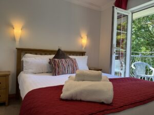 The master bedroom is equipped with a king-sized bed, an en-suite walk-in shower, and French doors leading to a balcony with views over the garden.