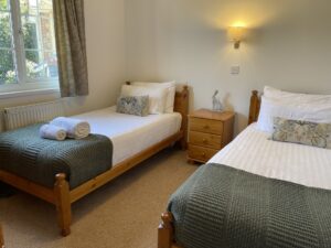 The second bedroom is a twin room with views over Chestnut Mews’ entrance.