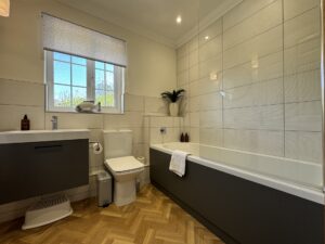 There is also a newly renovated family bathroom with a full-sized bath and a shower overhead.